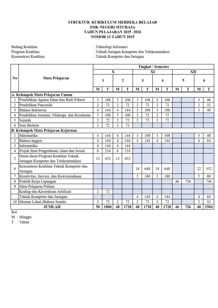 Teknik Komputer dan Jaringan (TJKT) membekali peserta didik dengan pengetahuan dan keterampilan mendalam di bidang teknologi informasi, khususnya terkait perakitan, instalasi, konfigurasi, dan pemeliharaan perangkat keras (hardware) komputer dan jaringan komputer. Jurusan ini dirancang untuk menghasilkan teknisi muda yang kompeten dan siap menghadapi tantangan dunia kerja di era digital.